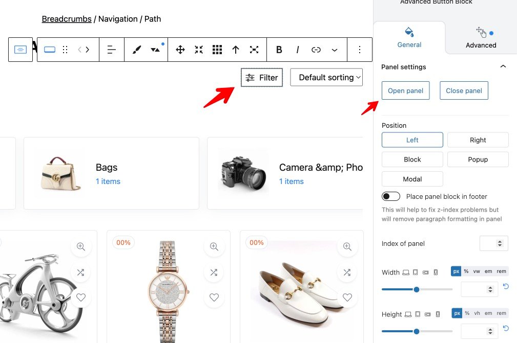 The most common templates which you will change are Front Page and Product Catalog. In the product catalog, we added Filters in sliding panel. So, you need to click on “Open Panel” and add your own filters via core Filter blocks of woocommerce.
